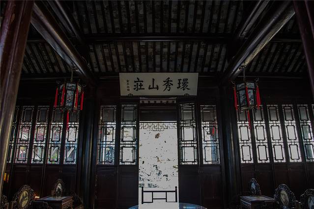 走进之后就是主人会客的正厅了,摆设和其他园林的正厅大同小异,最特别的一点就是正厅直接开了一扇后门,坐在屋内就可以观赏到。