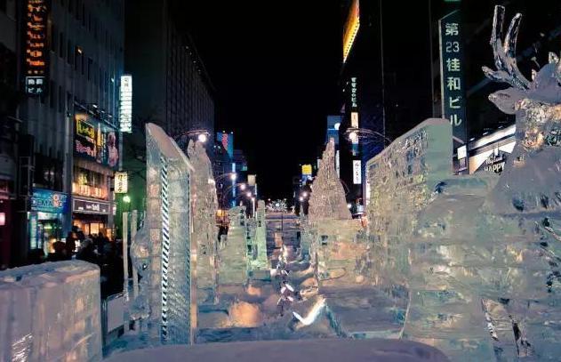 薄野会场位于札幌最大的娱乐区中,在薄野的主要道路上设置了一列冰雕的展示,大小冰雕多达100座,在这里能看到许多由附近酒店的厨师制作的冰雕作品。