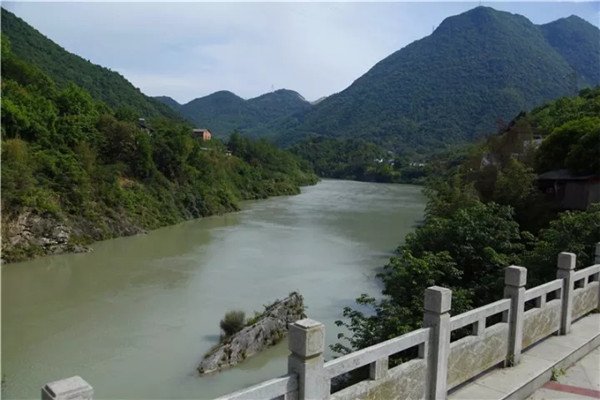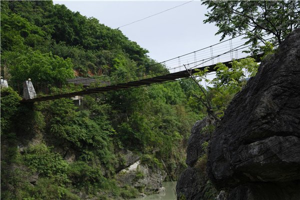 河水缓缓流淌,波澜不惊。河上架有一座铁索桥供日常通行。旁边还建有一座专供游人休憩的通口亭。