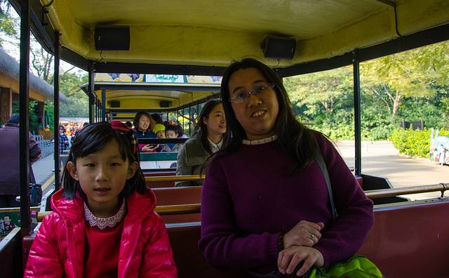 进了景区我们抓紧时间往散养区的小火车方位赶路,想第一批乘车。淡季是好啊,人比较少,可以随便选座。只是小火车上拍照不是很方便,能用的不是很多。