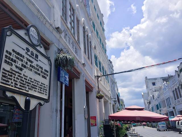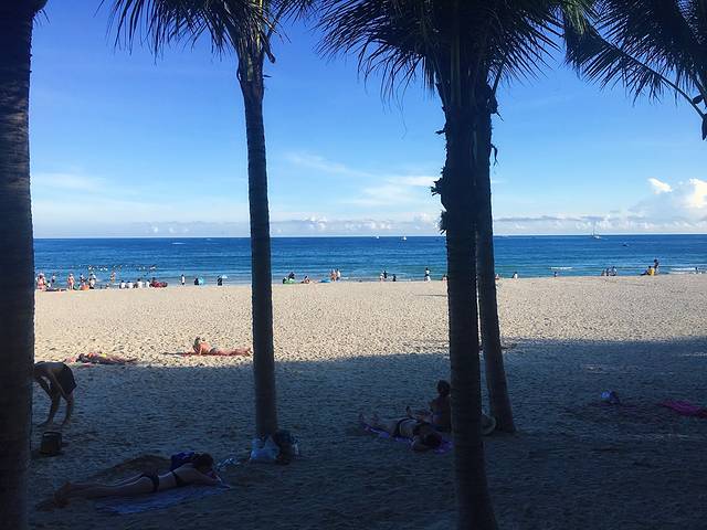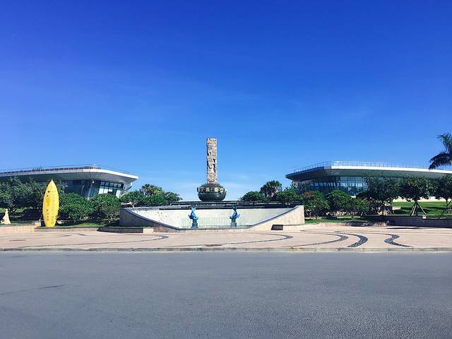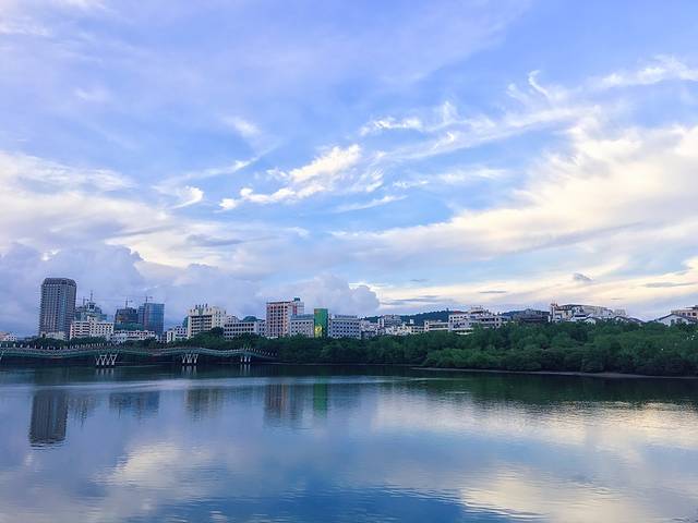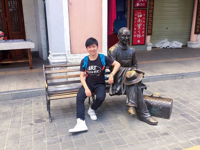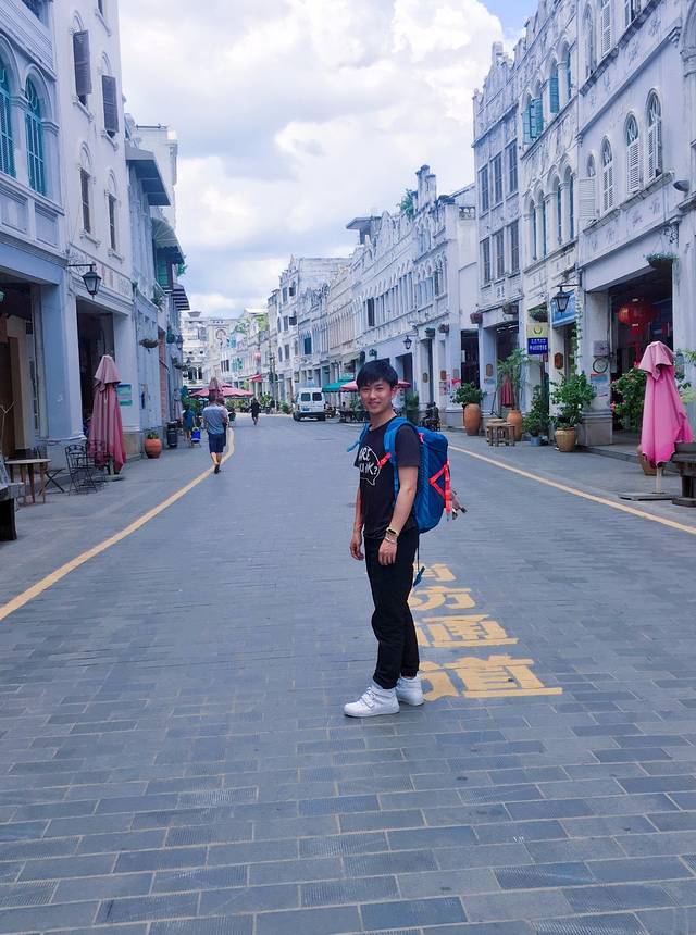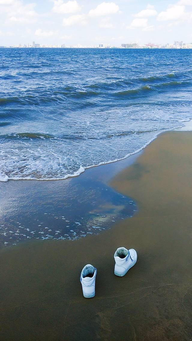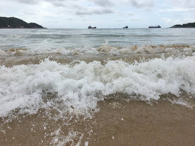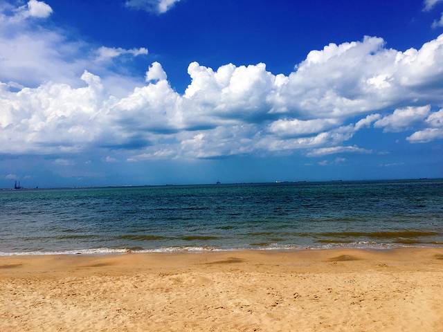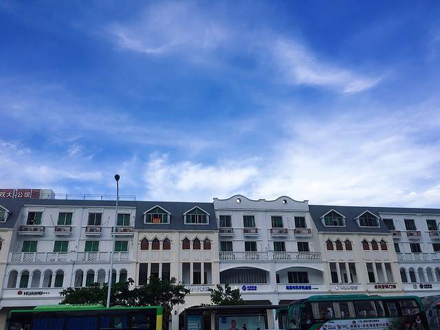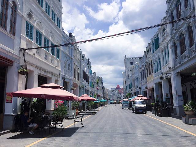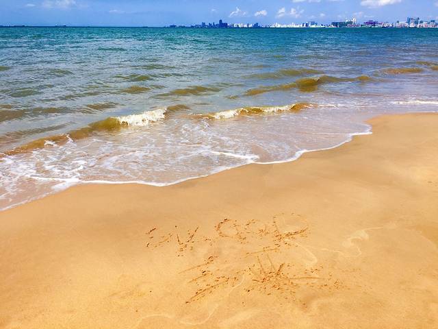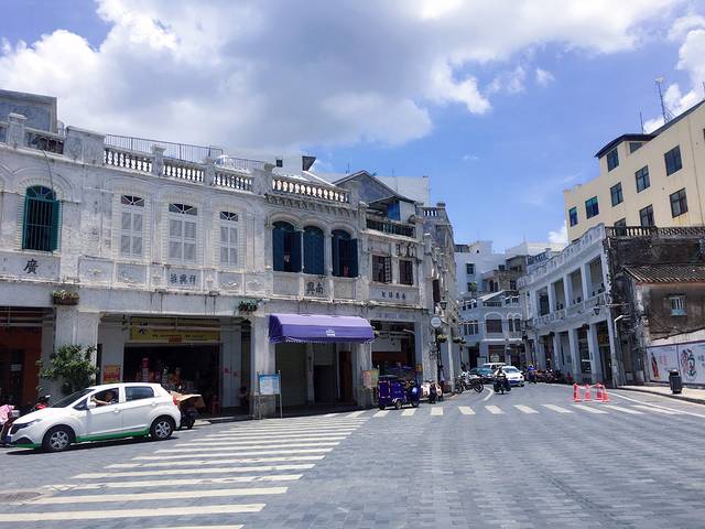 我们把骑楼逛了个遍,除了翻新的骑楼还有真正的民居,从南阳骑楼老街展示馆一直向前穿过振东街到和平桥,穿过桥做公交,珊姐带我们去海边,去假日沙滩,左沿是葱翠的林麻黄林带,其间错落着度假村、宾馆、游乐场等;右沿是碧波万顷的琼州海峡,海面船只穿梭,犁银溅玉。阳光、海水、沙滩、椰树想起了外婆的澎湖湾。本来我是运动休闲鞋加长裤,看到海水立马去一旁换上了人字拖和五分裤。