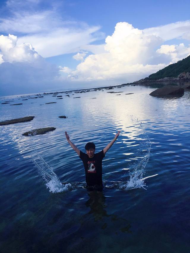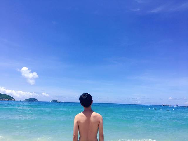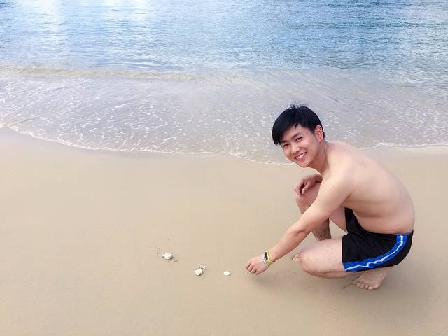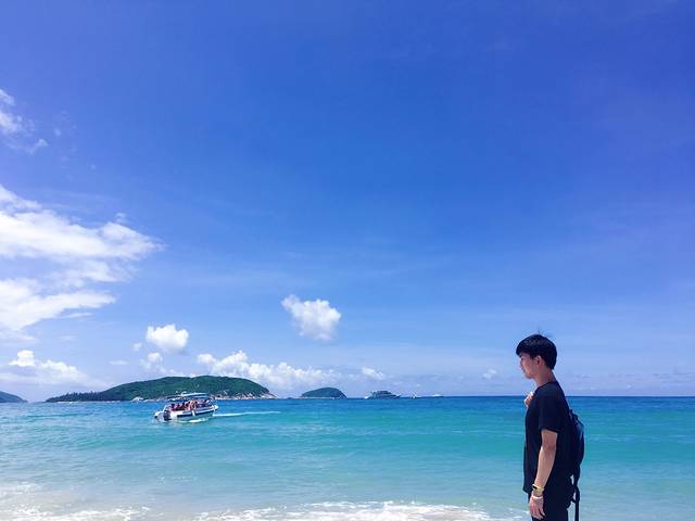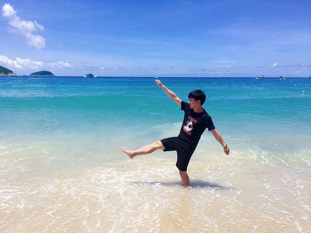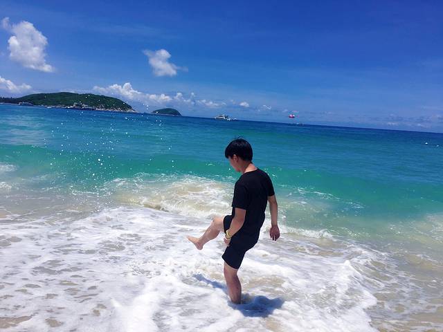 到海边第一件事就是拍拍拍,背影,侧脸,踏浪,跳跃……在大太阳下拍了几十个动作,也是辛苦了我的小伙伴,长长的沙滩人并不多,以至于拍出来的照片看不到别人,男生嘛,本来就穿着短衣短裤来的,也不需要换衣服什么的,就把东西放在岸边就下海玩水了,亚龙湾细腻的沙质、透明的海水如何梦幻一样呈现在我的眼前。海水与蓝天交汇,无法分出天际线。当我一步一步地走进海水很远,都能清楚地看到自己的腿和脚,这种感觉真好。游泳我是穿着短袖的,防晒霜只涂了脸,游泳上岸把衣服裤子放在躺椅上晒了一会儿就差不多快干了,
