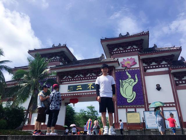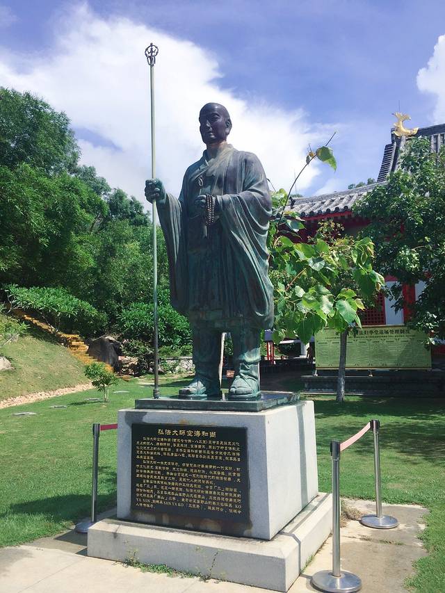 进门处写着:不二,不二法门,佛教有八万四千问,不二法门是最高境界,入此门便进入佛教圣境,大门外是:不二,门内是:一实,看天气好就先去了海上观音,其实路线图网上推荐的是:不二法门—金玉观音—慈航普度园—刻经文的墙壁—佛陀馆—大象石雕—三十三观音堂—吉祥如意园—南山寺—返回到大象—108米海上观音—密法归华堂——不二法门,而我们先打算一路先直奔海上观音,路过密法归华堂,密法归华堂位于南山108米海上观音广场前,占地7000多平方米,是中国首个展示佛教十宗之一“真言宗”东密的建筑、坛城、法器及仪轨的文化平台。其主要建筑是一座占地600多平方米的日本风格唐风建筑。“密法归华堂”前安放着一尊高2.8米的日本空海大和尚铜像。主要是为了纪念失传达1200年的唐密文化。公元804年,日本派遣空海大和尚渡海来华留学,拜长安惠果大和尚学真言宗即密宗,受金刚、胎藏二界密法。后来,空海大和尚东归日本后弘传密宗,所传密法为东密。而原本在中华大地传承的唐密则遭遇唐武宗灭佛,几近灭绝。由于东密在教理上完全承袭了唐密,因此东密归华也被视为唐密归华。