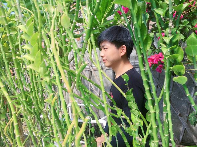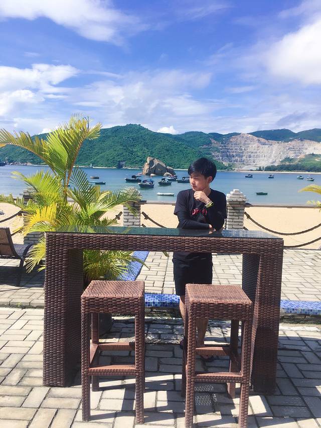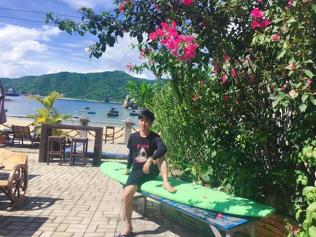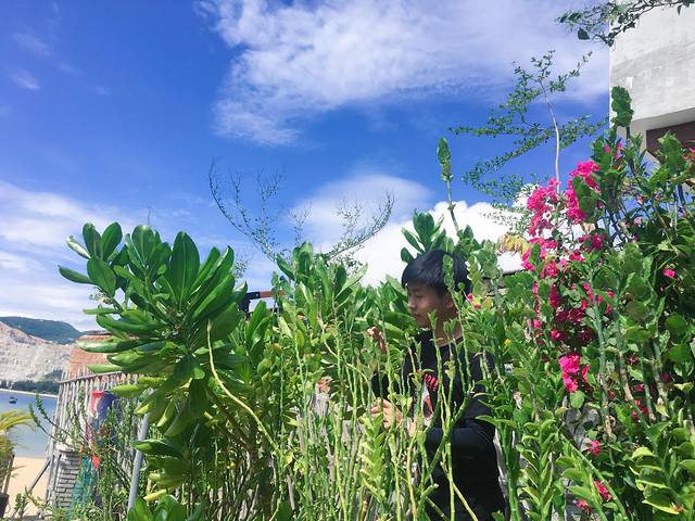8点多起来,外面一片艳阳高照,于是打算去皇后湾玩水,老板闫大人说在皇后湾的海边也有他们的一家客栈,可以去那放东西换衣服,码头到皇后湾也就走几分钟,穿过几排居民楼就到了。大大的后院朝向海边,院子里种着各种花草,摆放着各种桌椅,都好适合拍照。近处 花草,远处的蓝天白云和湛蓝的海,美的不要不要的,而且沙滩边没几个人,一片未被世人打扰的世外桃源,前拥蔚蓝大海、背倚苍翠群山,视野非常广阔。偌大的海滩似乎都被我们承包了。