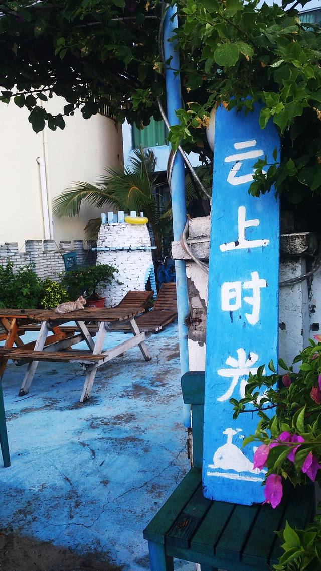 火车到达亚龙湾已经6点半了,本来有直达蜈支洲岛码头的直达车28路,但是17点就最后一班了,那就等33路,可以到301医院,再转海棠湾1路,公交车站一直有黑车叫我们坐,我们才不信,33路晚上9点还有的,10几分钟后,没想到28路来了,6块钱,不过也还是只能到301 ,301医院到蜈支洲码头也就是后海村,才相距一站,不过也坐了十来分钟。下车后跟着地图到达了我们预定的:云上时光青旅,就在靠码头最近的位置,13年三个大学生合伙开的。