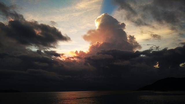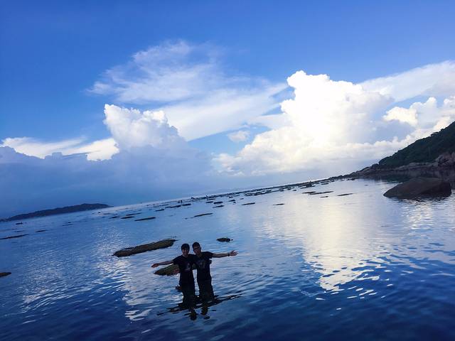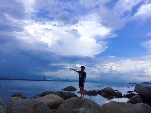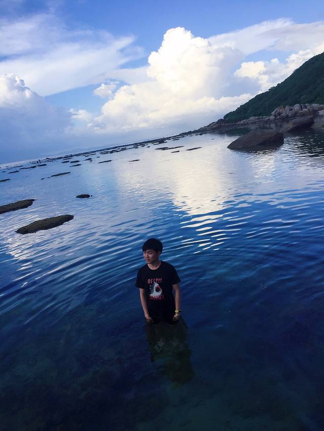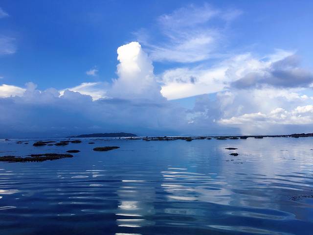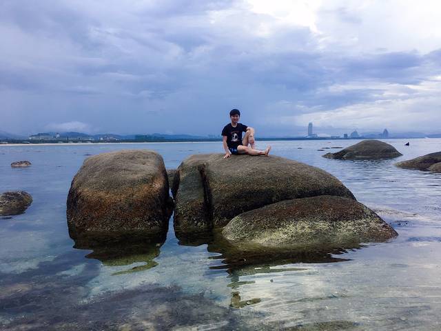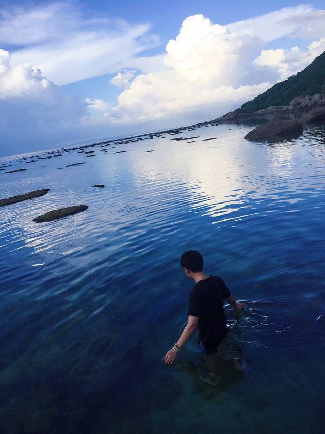 11点多从海边回来,午睡到三点多才起来,外面下起了雨,于是在大厅的沙发上躺着,四点雨停了,天晴了,和毛毛还有小伙伴去码头边的龟岛,岸边都是大石头,潮水退了很多,水很浅,不到腰,但是能看到海底的珊瑚和各种小鱼,于是各种拍,带着防水套不好拍那就立马摘掉。一路向前。早上这里是浮潜的好地方,听到旁边一个游客说这里比蜈支洲岛那的码头边更好看,一直玩到7点,直到夕阳西下,傍晚的云依然美爆了,我喜欢的春天的花,夏天的云,秋天的风和东西的雪。