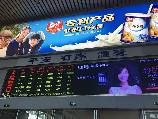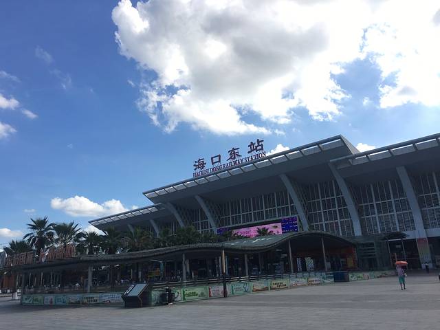 玩了个把小时。三点半了,要去坐公交,赶去高铁站了,17点的高铁去亚龙湾,珊姐说这里到海口东站很远,车也很少,珊姐带我们坐公交到市区南,再告诉我坐9路直达高铁站,很幸运刚下公交,9路就来了,但是真的坐了四五十分钟,下公交已经16:37了,还有不到半小时,虽然高铁站就在眼前但是还有几百米,背着包穿着人字拖还是一路小跑,不过人并不多 ,从到高铁站到取票到过安检到候车室才花了10分钟,第一次坐高铁铁轨不是在地面,而是在几层楼的高度之上。