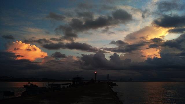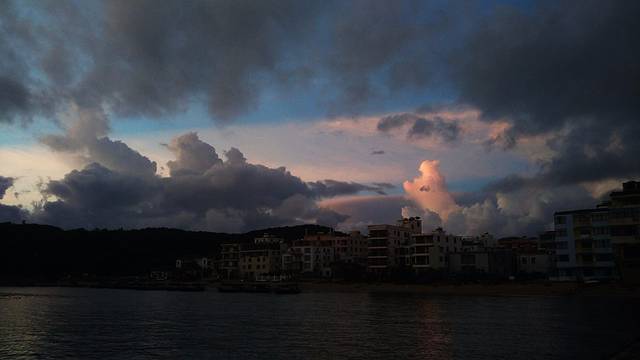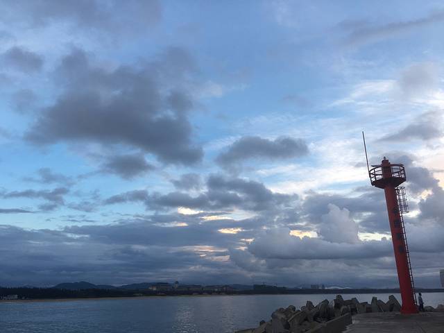 青旅我订的六人间,昨晚玩了狼人杀睡觉,才知道和我同房间的还有一个人,是来自内蒙赤峰的在江西上大学的毛毛,聊天到2点才睡,聊得很尽兴虽然知道明天早上5点多就又要起来了,因为想看日出,因为后海村就是千禧年中国直播日出的地方。抹黑去了皇后湾,感觉码头边更适合看于是又回去到码头边,就这样坐在码头上看着天上的云,奔泻的云海,各种颜色,像是远在天边又似近在咫尺,轻拢慢涌,铺排相接,变化多姿,一会儿四周都被各种姿态的云簇拥着,只有正头顶是一片蓝天,