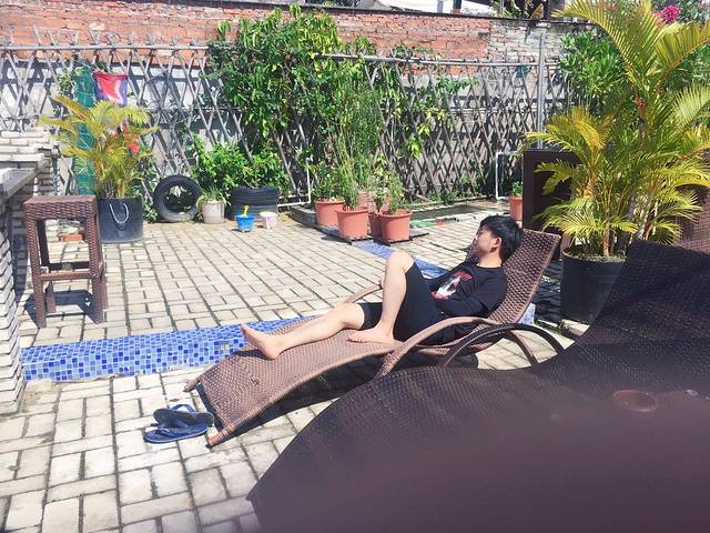 回到家,毛毛也来这住了,我叫他来的,因为他明天中午要去海口坐飞机,他住后海离市区太远了,如果住那早上要早起,感冒了,不如今天白天来这边,坐车方便多了,今天晚上还可以好好睡一觉!到楼顶看日落成了每天必做的事情,
