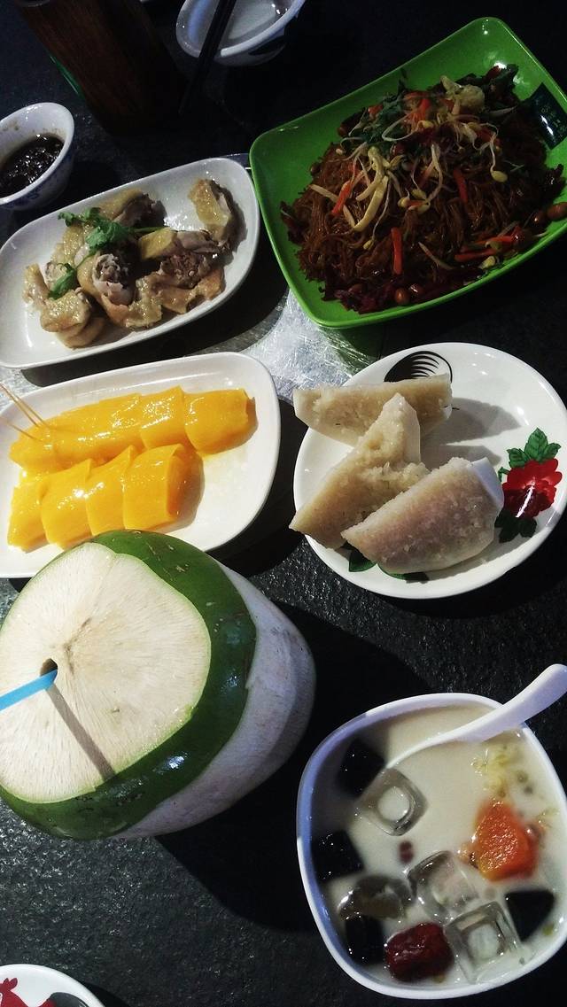 10:15下飞机,路旁都是椰子树,海南的确还是比长沙热点,却也没有想象中那么热,我依旧穿着防晒衣,长束脚裤和运动鞋 ,给珊姐打电话,珊姐是我去年10月在亚丁认识的,同住景区里的尼玛客栈,第二天和她还有其他小伙伴一起徒步到五色海,冬天她旅行到长沙,我也带她去吃了一下长沙小吃,所以这次她也说要带我去好吃的!珊姐要我坐机场巴士一号线到琼剧院下车,她来接我,因为我想去骑楼老街,来海口最想去的地方就是骑楼,所以我们打车到骑楼附近吃小吃,带我们去了老街文化茶馆,点了:文昌鸡,芒果粉,椰子饭,海南粉,清补凉,还有一人一个大椰子,真的好饱,吃完就去骑楼老街逛逛。