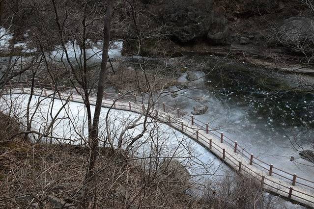 此行未曾料到的是青天河的河流竟然没有结冰,问了工作人员才知道,原来青天河冬季的气候特点是寒而不冻。纵然两岸山峰积雪覆盖,冬天的大泉湖却仍然仙气十足,再冷的天气它也不会完全结冰,水面上蒸腾着缥缈的雾气,构成了一幅仙境般的景致