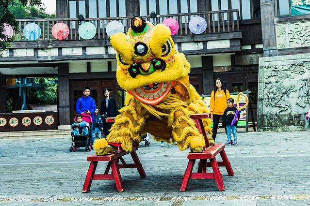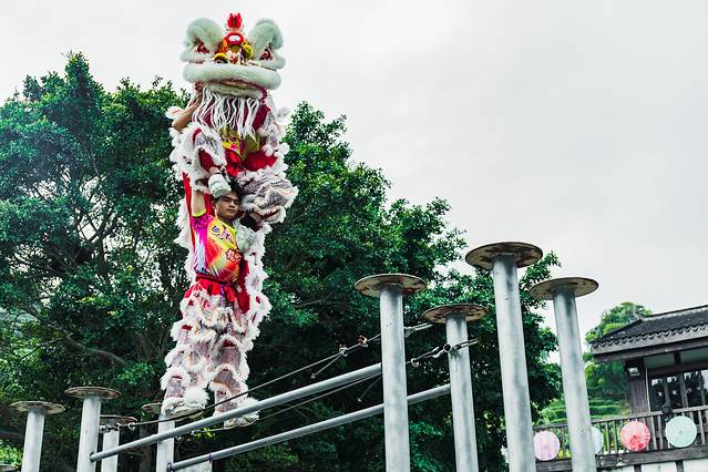 虽然舞狮的几位表演者看上去年纪不大,但是可以看得出来他们的技巧及其娴熟。在锣鼓声中,敏捷的一跃便跨上了一米多高的柱台,然后踩着鼓点,用在我们眼中不可思议的方式,轻巧的在一个个柱台之上腾挪转移,更有让人惊呼的走钢索、蜻蜓点水等招式,轻灵敏捷、刚柔并济的表演引得围观的我们一阵阵喝彩。
