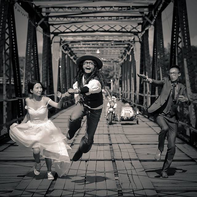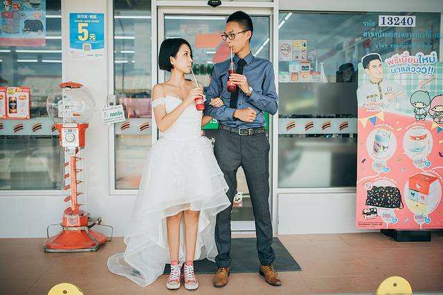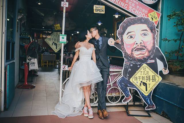 Jack几年前白天在二战桥摆摊拍照,住在Aya附近的话骑摩托车过去15到20分钟。晚上他开着自己的复古甲壳虫在Aya边的夜市摆摊卖明星片。很多人都会过来找他,演各种剧情拍婚纱照,四年前我帮客人拍摄杰克时就想过,我以后也要来拍一张这么有意思的婚纱照。4年后带着表嫂来拍了这一张…