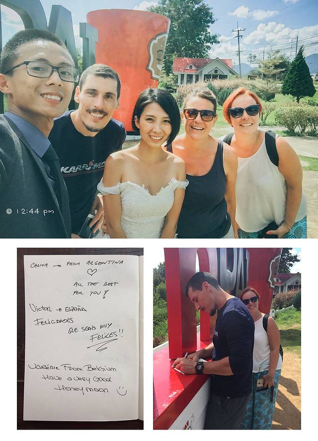 之前来Pai并没有这几个字,现在这应该算是PAI辨识度最高的地方了!这里游客很多,排队拍了很久,还帮别人拍了不少游客照。排到我们,给表嫂拍了几张单人的,又来了三个歪果仁,找他们帮忙,给他们看了我给表嫂拍的构图,告诉他们要站在那里,怎么取景对焦,一次完成,清晰准确曝光完美。我拿出手机要跟他们仨合影,他们激动的像200斤的胖子,这是他们写给我们的祝福,分别来自阿根廷、西班牙、比利时!