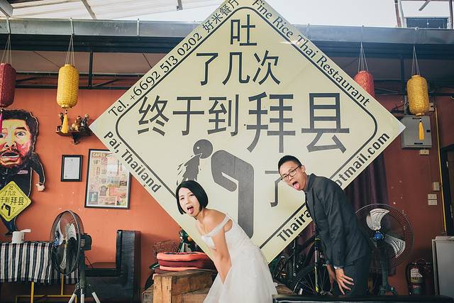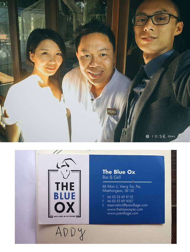 Pai县的网红餐厅,老板是餐厅的吉祥物,就是这惊悚表情的个大胡子。这个吐到拜县的路牌也是他设计的,几年前第一次看到这个牌子就........这简直是神设计。不解释,去过pai的人都懂!心心念念来到餐厅门口看了看环境,服务员过来招呼我们进去吃饭,但她不是很懂英语,用手比划了几下表示我们只是想和他们老板合影。后来请她帮我们拍了上面这张!