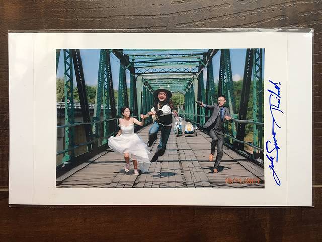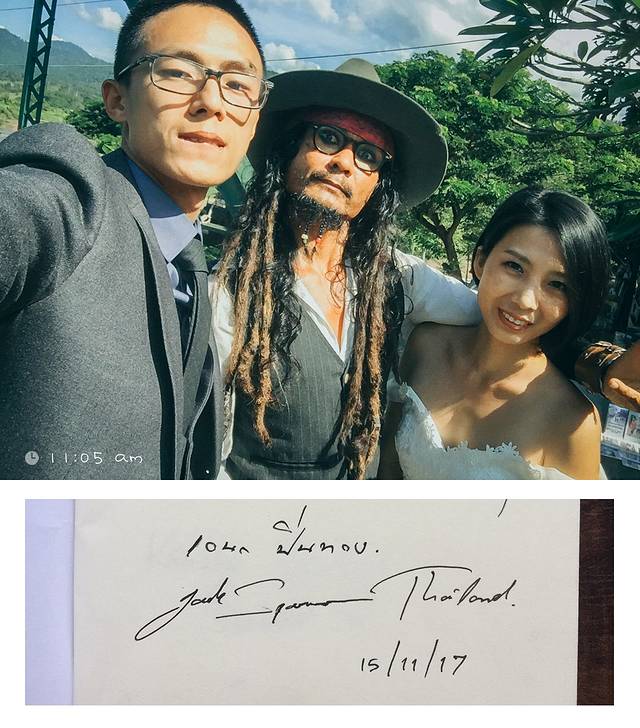 很幸运在我们拍摄时桥上没有其他游客。Jack是非常专业的摄影师,安排我们站位剧情,摆放灯光,而且这么热的天气,为了扮演海盗里外穿了好几层,表现力超足敬业,照片没有达到他的标准主动重拍。之前来拍是80株,今年来只要60,照片打印出来60株,拷贝电子版另外再60株(拷贝要提供sd卡或者cf卡,没有卡的留下邮箱,他下班之后发送)。在签名中他写了自己泰国名字和杰克。