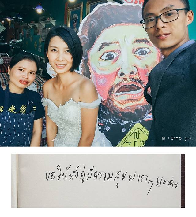 之前最大的路牌是放在餐厅门口的,现在挪到里面了,我们进去跟一个懂英语的小哥交涉了下我们想拍路牌,小哥很配合,帮我们挪开前面的桌椅方便我们拍摄,我和表sao上去一人摆了个吐的动作。帮我们拍照的大姐在留言本上写了一串泰语,至今我也不知道写的什么意思。临走前问了问他们大胡子老板何时在店里,得知他又出国旅游了,餐厅墙上是大胡子全世界旅游的照片,有大部分是在中国,他喜欢中国。还收了几个中国徒弟教他们做泰餐。貌似那几家店生意都挺不错!最近看他朋友圈,胡子头发都剃了,刚刚有了baby!周围有甜品店,火锅店,旅馆等5家店都是他陆陆续续开的!有事业,有家庭,有情怀的人生赢家!