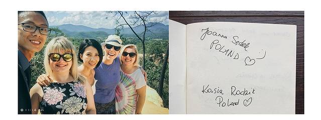 拍在悬崖边让她帮忙拍摄,我告诉她按住快门不放可以连拍,我会选一张最好的。 “……嗯…”她的一组连拍没有一张对上焦.....好吧…教她如何对焦后第二组…依然没对上焦, 好吧没关系,虽然没对上,但是照片的感觉我很喜欢,我不想去重复做同样的动作,那种状态下的照片不是我想要的。感谢之后请他们在手册上签名,他们来自波兰。