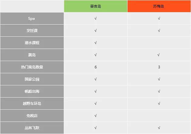 下面这张图片对比了在普吉和苏梅岛上可以体验到的玩乐项目,当然打勾越多,可玩性就越高咯。