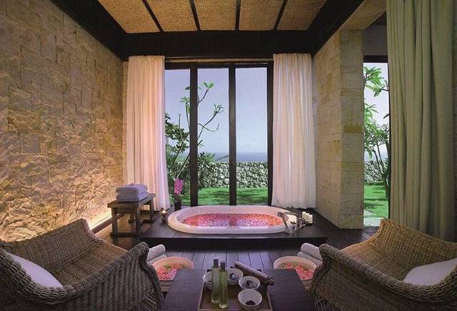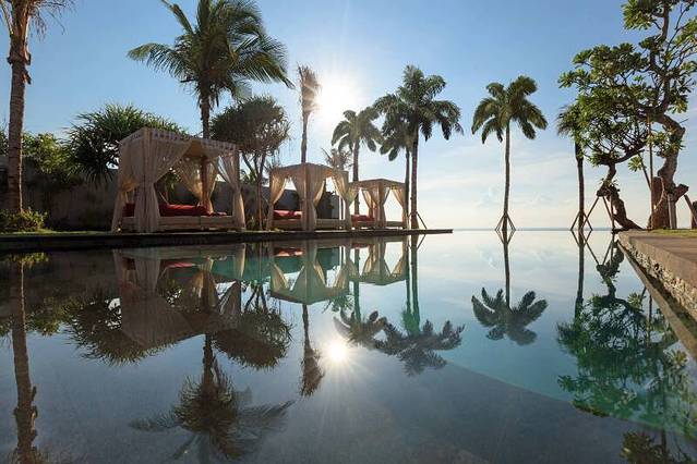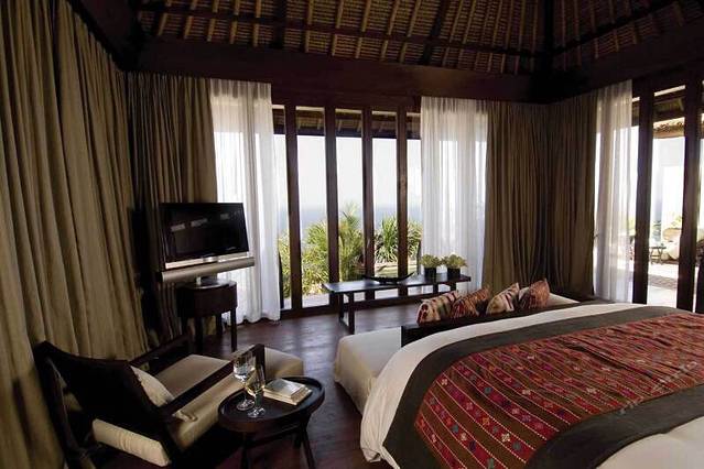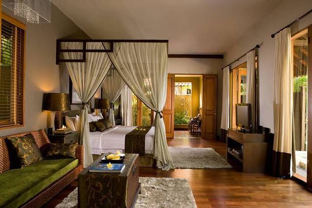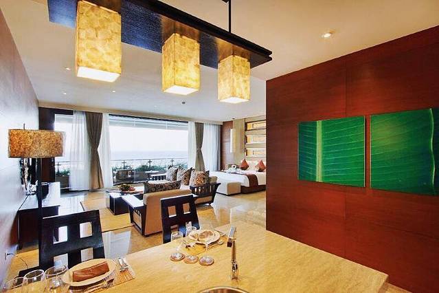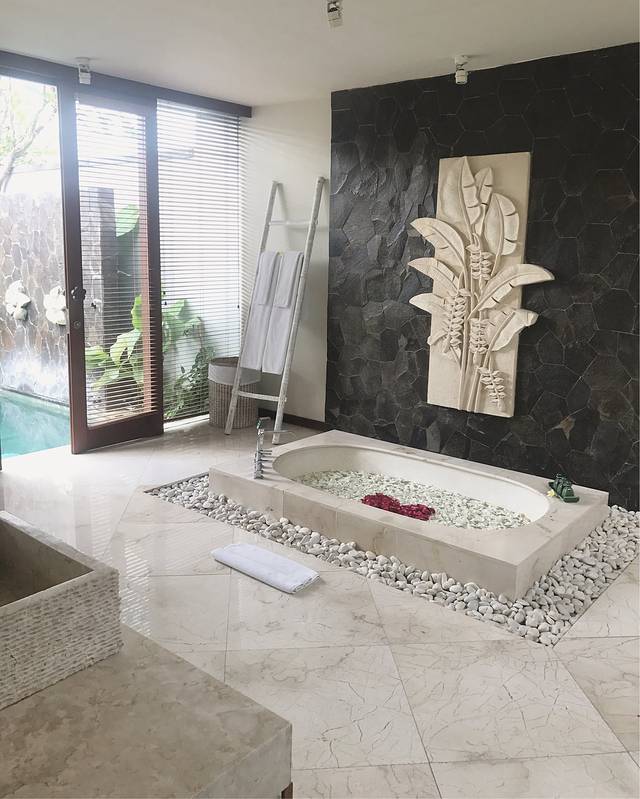 酒店位于乌布,餐厅和大海紧密相连,整个房间是淡淡的豆沙粉和乳白色,又很有印尼的特色.