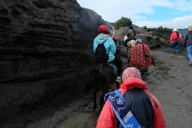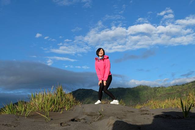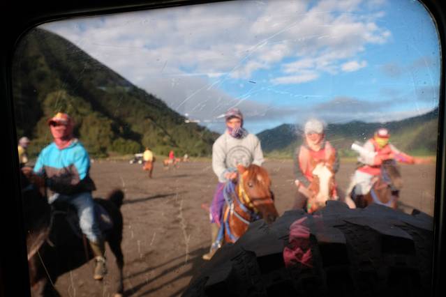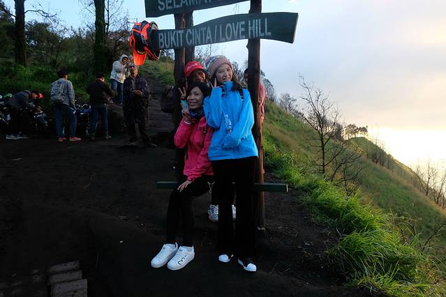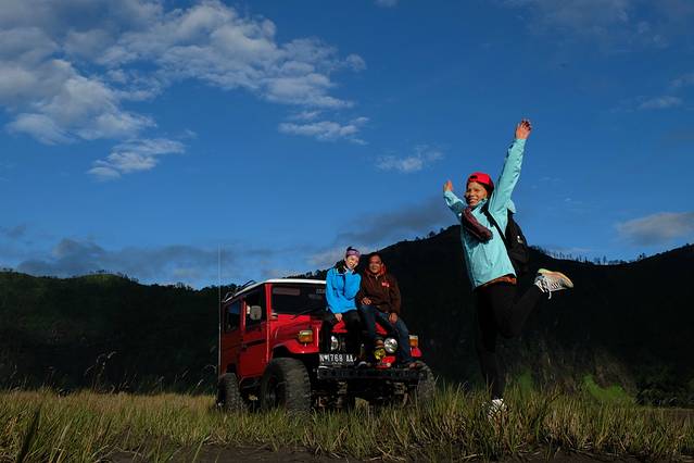 印尼小哥接机后,大概4小时左右,我们便来到火山脚下,是凌晨2点。印尼小哥做好交接后,就把我们交到吉普车司机的手上,吉普车红色的,我喜欢。一路上,道路弯又弯,我吐了,娘亲也吐了。吉普车司机便体贴的照顾着。