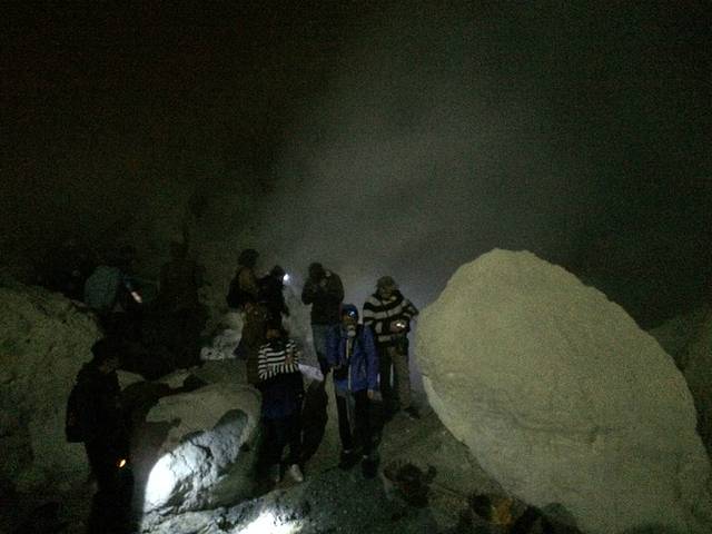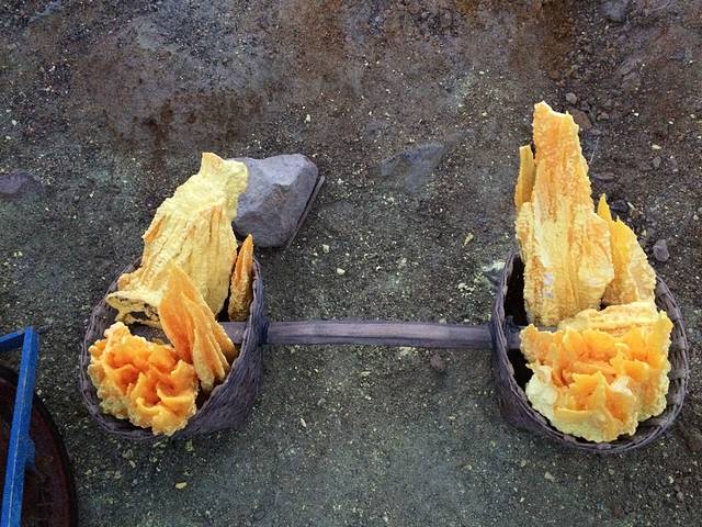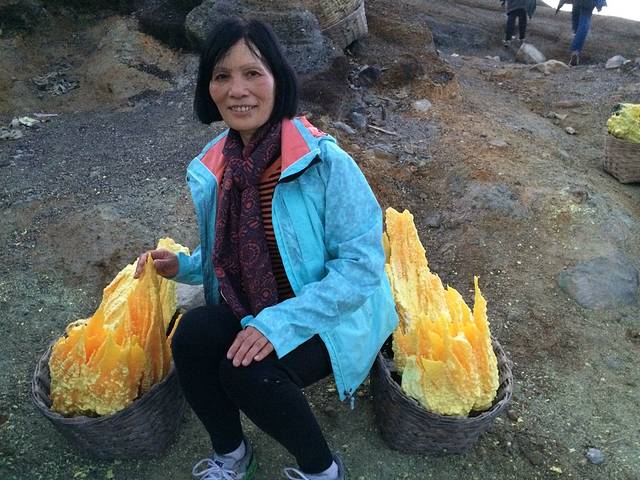 宜珍火山以绿色的火山湖和硫磺矿出名。据了解,凌晨的上山面已经有很多的采矿者了,这些采矿者一般生存年龄在40岁左右,因为山上硫磺毒气弥漫的原因,采矿者也没有很好的防毒工具。娘亲觉得他们好可怜,在有毒气体的火山上工作一整天,得到的报酬就仅仅的45RMB。
