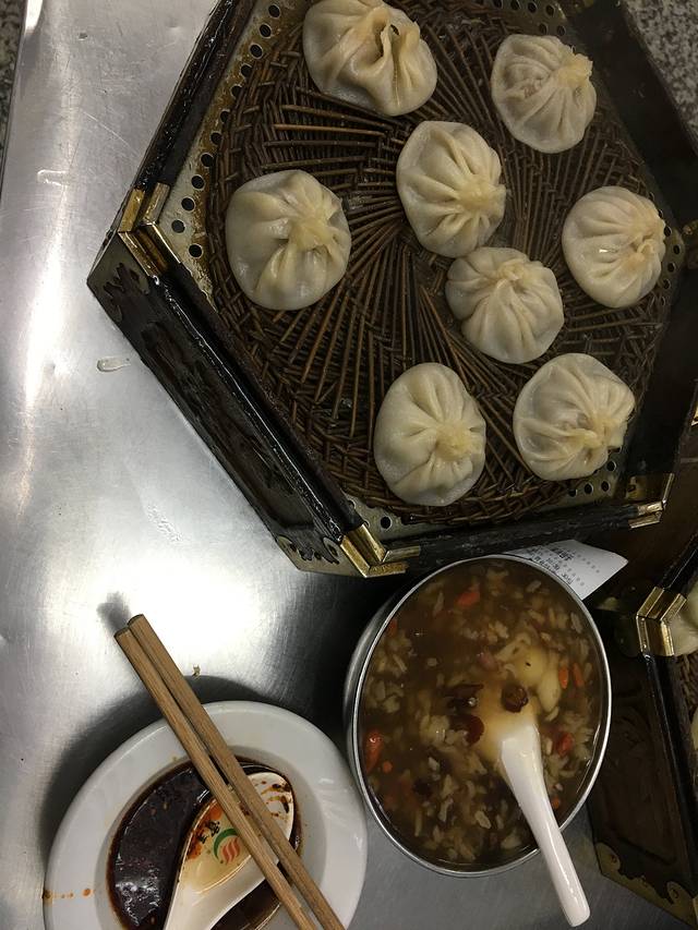一笼牛肉灌汤包加一碗八宝稀饭,一口下去,汤汁味美。