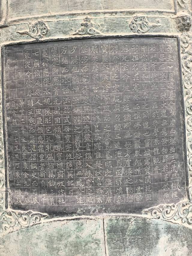 钟身正面有骈体铭文一段,共292字,分为18行,每行17字,空格14字,字体为稍参篆隶的楷书。此铭文由唐睿宗李旦亲自撰文并书写,内容是宣扬道教教义,阐述景龙观的来历、钟的制作经过以及对钟的赞扬,是李旦传世极少的珍贵书迹,故此铭文为研究书法史者所珍视。