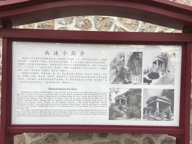 兵谏亭位于陕西省西安市临潼区骊山风景区,西安事变时杨虎城和张学良两位将军在此将蒋抓获,以谏停止内战,一致抗日。