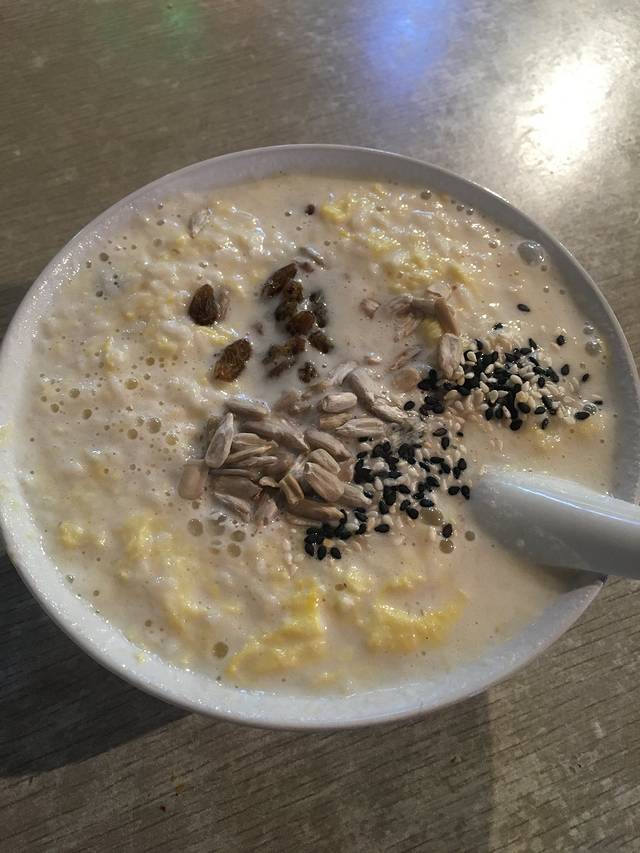 选了可口早餐,肉夹馍和八宝稀饭,一会儿车上吃。