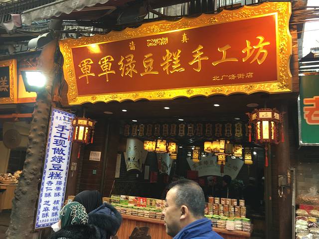 军军绿豆糕,有名气,纯手工制作,不很甜,买一盒吃好久。留着晚上当点心吃。