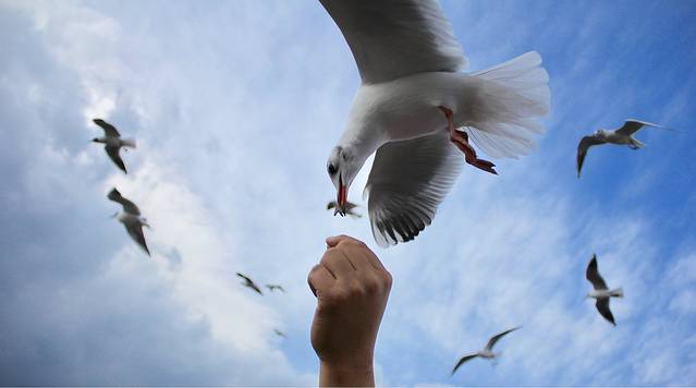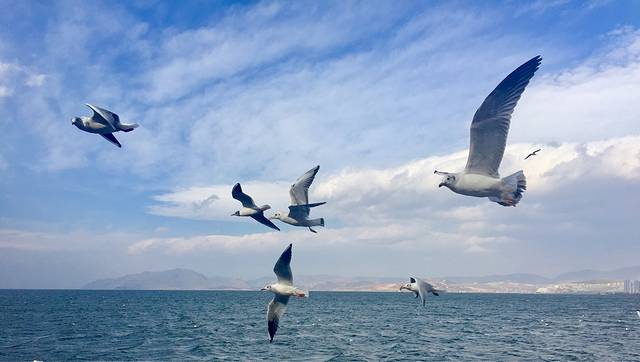 放下行李收拾好了就出门到海边上,很多海鸥,只要你扔小饼干就会飞过来接住