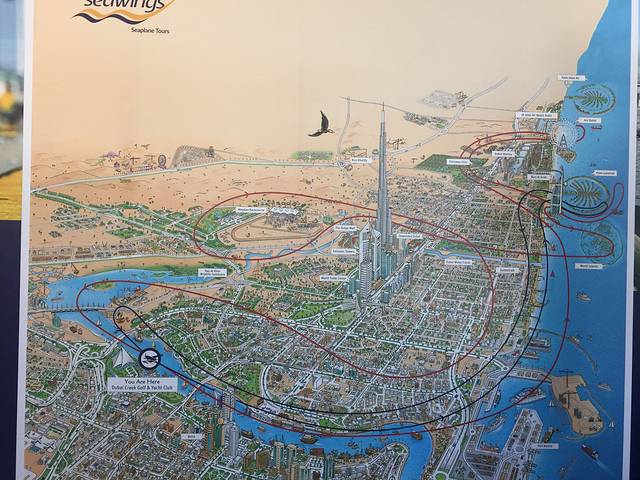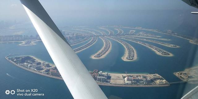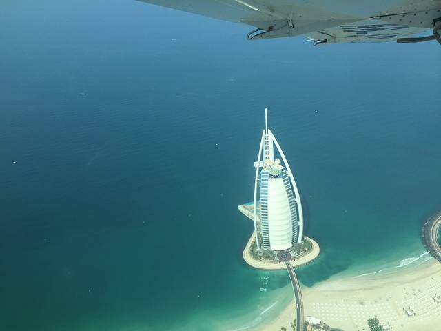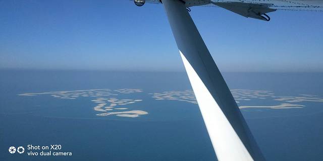 登场的水飞机:小巧的机身便于飞行✈️,机长一系列的操作让我看的眼花缭乱(多花170迪拉姆,也就是300元不到的人民币买了个副驾驶位,这样会更好的视野来观赏飞机外的景色),整个飞行中你会领略帆船酒店(还有顶部的直升机🚁停机坪和高尔夫球场—“世界地图”工程项目—棕榈岛—市中心的天际线,从天上俯看迪拜有着不一样的感觉。