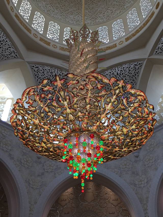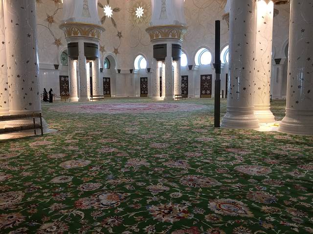 主祈祷大厅的波斯地毯是世界上最大的手工编织地毯,造价580万美金,由1200名伊朗工人采用38吨从伊朗和新西兰进口的羊毛历时一年半编织而成的。