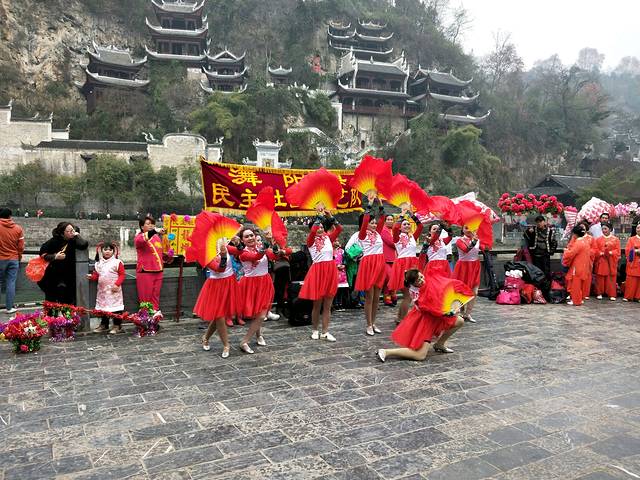 青龙洞景区对面的文化广场有广场大妈在表演