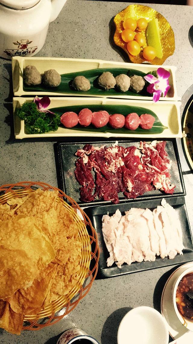 点了手打鲜牛肉丸、牛筋丸、胸口朥、吊龙伴和牛舌。素食类点了炸腐皮,本来还点了萝卜片(因为牛骨汤底配白萝卜实属一绝),服务员提醒我们锅底会自带萝卜片就去掉了(店员服务周到好评)。最好吃的当属手打鲜牛肉丸,劲道十足,肉质细腻。