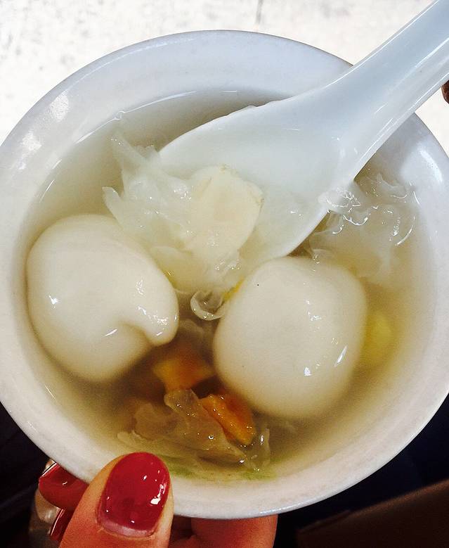 这一碗叫鸭母捻,在潮州各个小店也是随处可见。基本上就是汤圆,甜口的,汤里有银耳、白果等,也是甜的。广东这边好像还挺喜欢吃甜食的。