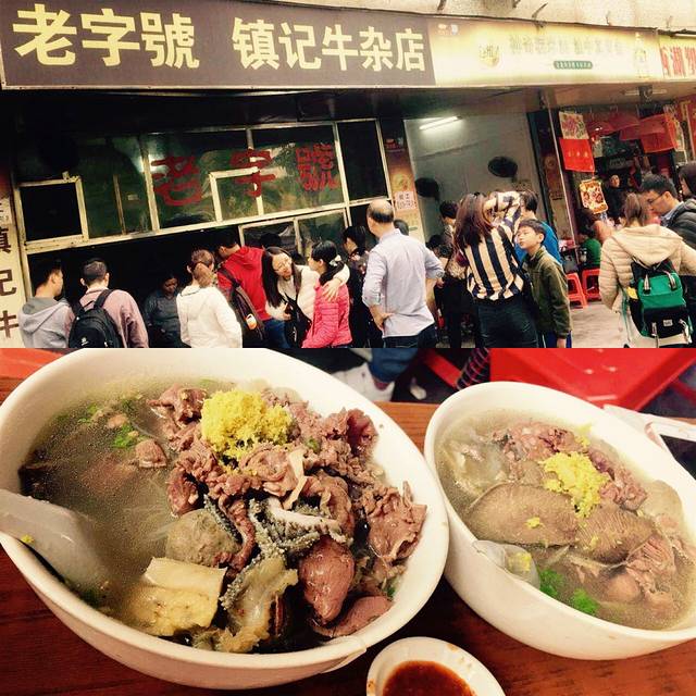 来到潮州西湖附近我最期待的是吃这一家镇记牛杂汤。就在潮州西湖正门的街上。有两家并立,一家装修较新,有两层;还有一家比较破旧,但一直有许多人排队,好像只做到18:30。