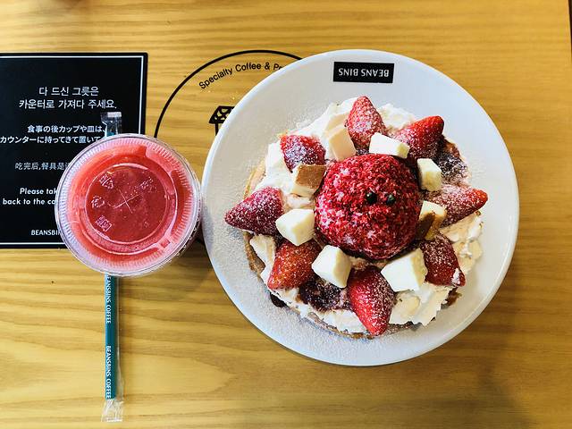 午餐的地方,很好吃的草莓芝士华夫饼以及生草莓汁。