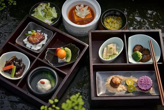 珍馐美馔的主题美食——隐秘在禅意山水里的浣月山房和风料理、融入东方禅韵的波罗蜜多酒店餐厅、以素养心的禅食馆。