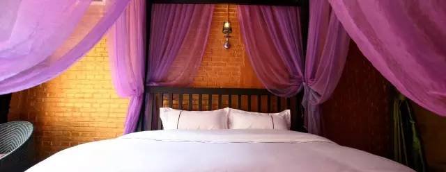 红砖墙面和雪白大床的色彩对撞,会深深刺激在你的记忆里,从卧室天顶垂下的圆形纱帐是最好的泰式诠释。