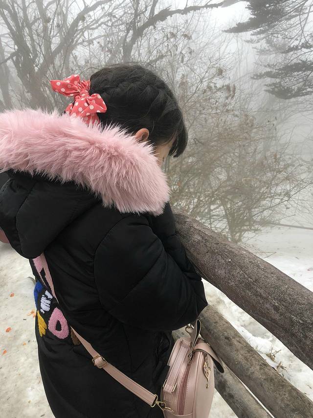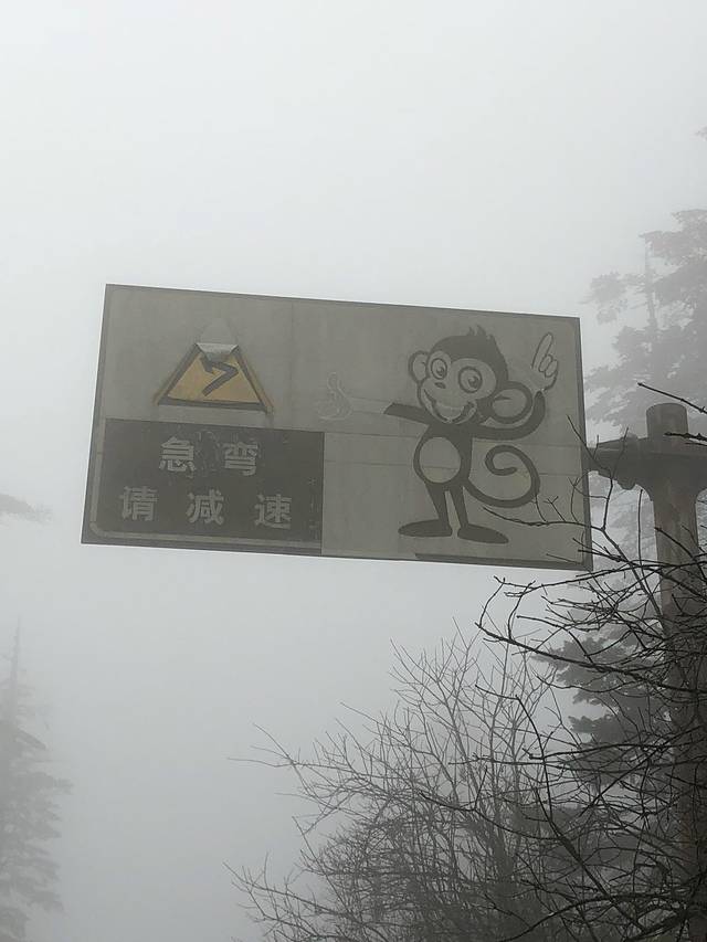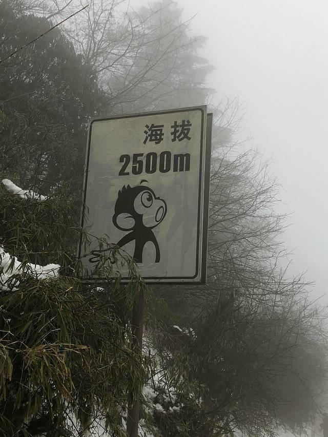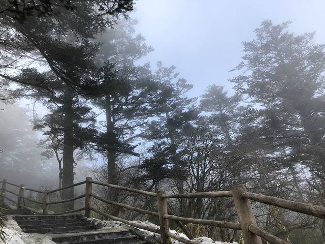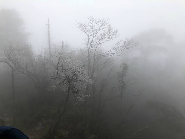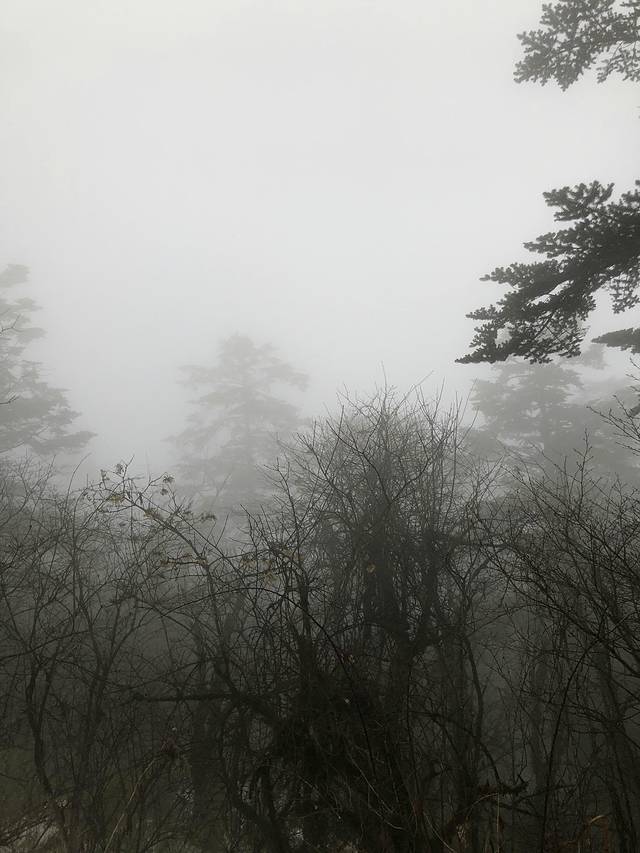 我们直接在游客中心搭乘登山专用大巴进入盘旋的公路,一路上天阴沉沉的,车辆在萦绕的云雾中穿梭,在盘山公路上急速爬升,车窗外雪花纷飞。经过1个多小时的激烈摇晃,车终于停在海拔2430米的雷洞坪停车场。整个雷洞坪停车场,被冬日惯见的大雾笼罩着,天空中不断有雪花飘落着,能见度很低,有一种要迷失的感觉。