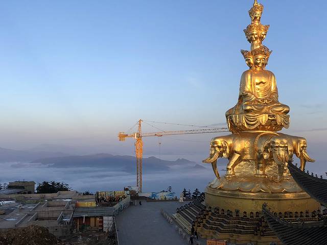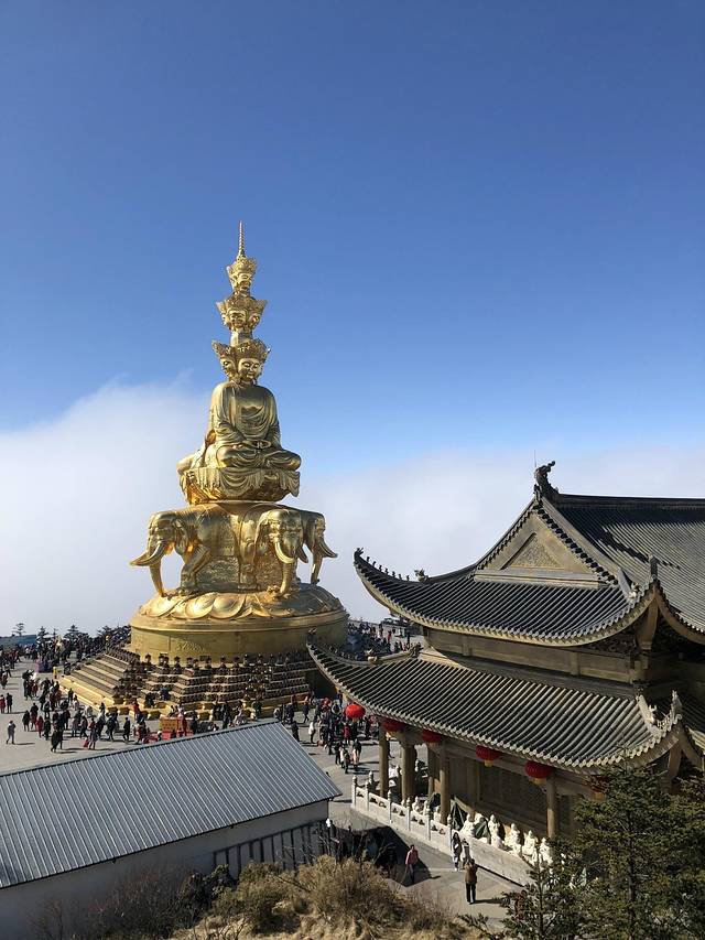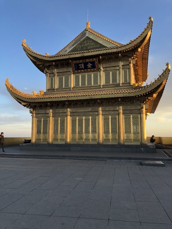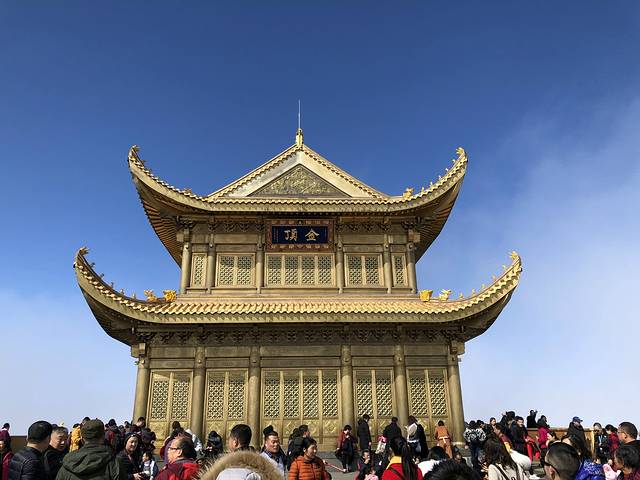 峨眉山金顶始建于唐朝,屋顶为锡瓦所盖,元代时又被称为"银顶"。寺侧有卧云庵,内有饭堂和客房可供游客食宿。在金顶可观看峨眉四大奇观--日出、云海、佛光、圣灯。金顶与千佛顶、万佛顶相邻,万佛顶上亦有建筑,但是这个季节山上有雪,是不能去万佛顶的。