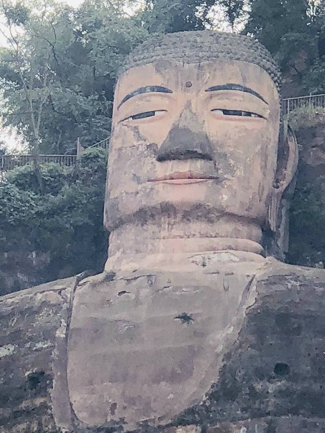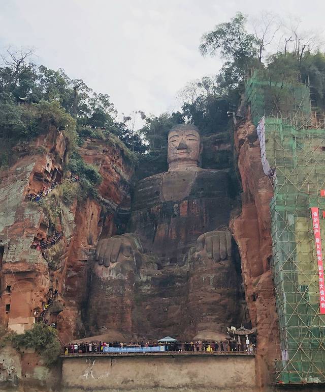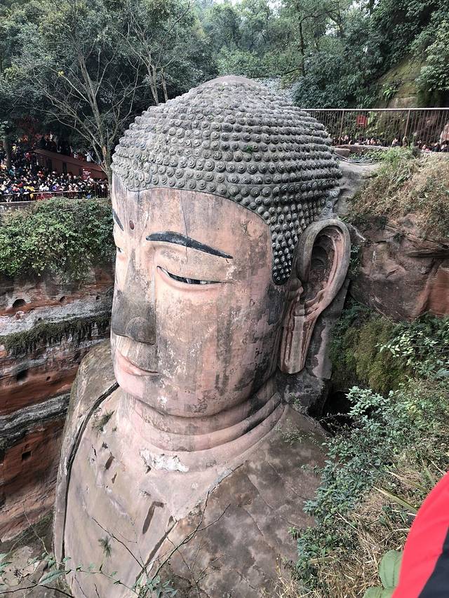 穿过凌云寺,便可看到大佛。还可以顺着石阶下到大佛脚下,一睹其全貌。但是因为人太多,排队就得等三四个小时,考虑时间因素,我们没有下去,就在山上看了看大佛。