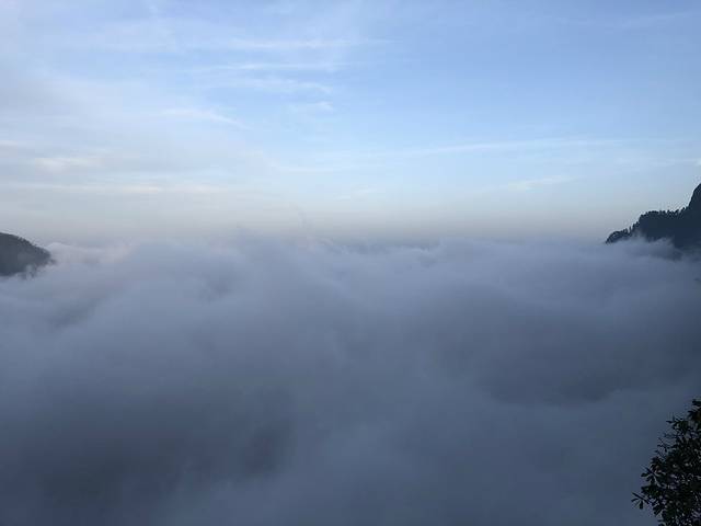白云从千山万壑中升起,犹如雪白的绒毯铺展,崇山峻岭宛若云海中的浮舟。现代诗人赵朴初诗曰:“云若覆衣迎日出,峰腾云海作舟浮。”