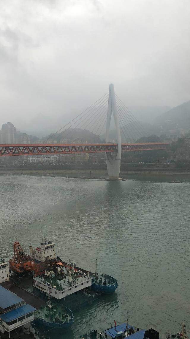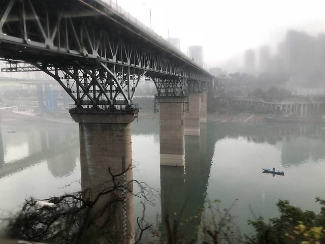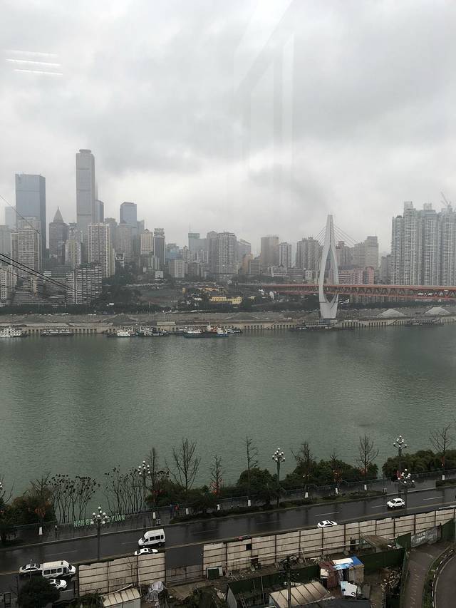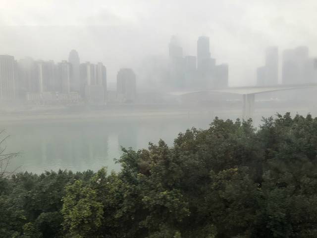 长江索道,穿梭高楼大厦之间,透过玻璃向外望去,不尽长江滚滚来,叠翠南山、江中半岛、桥都风采、外滩胜景,被雨雾笼罩着,若隐若现,宛如一幅水墨画卷。