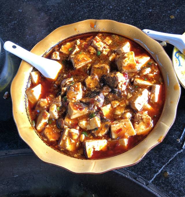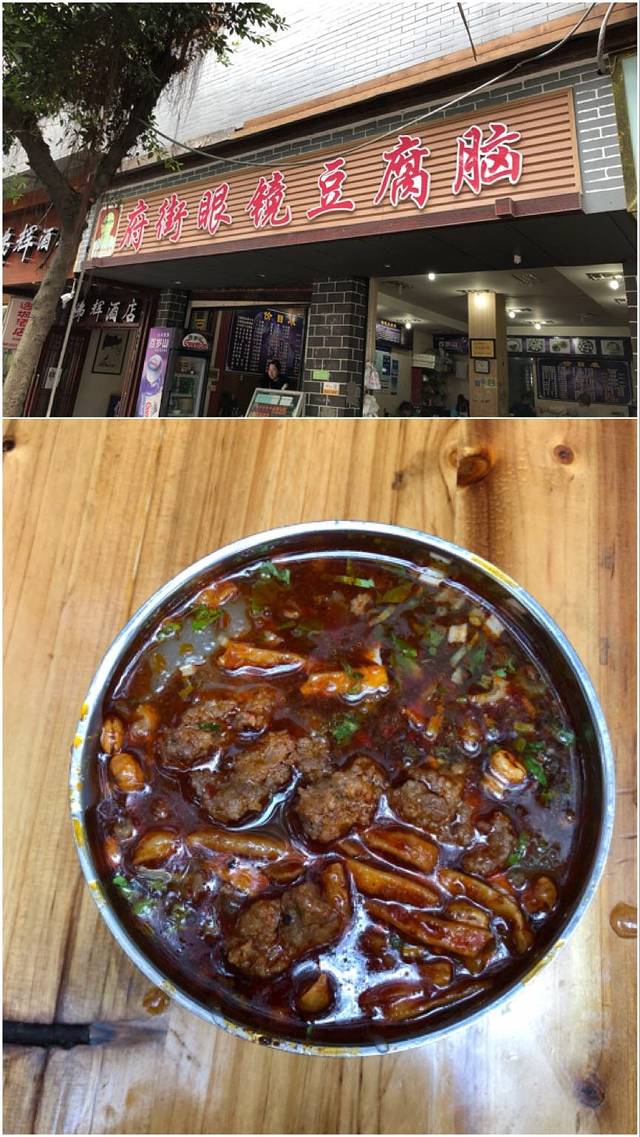 乐山豆腐脑不是以豆花为主,而是以绝对美味的汤汁勾芡而成的汤头为主。灰白的汤汁上漂浮着雪白的豆花,豆花之上一般可以选择蒸牛肉或者肥肠,还有深红的辣椒配着翠绿的香菜,要是喜欢还可以加上香酥过的黄豆子、花生等,乐山话称作“散子”,真是色香味俱全。