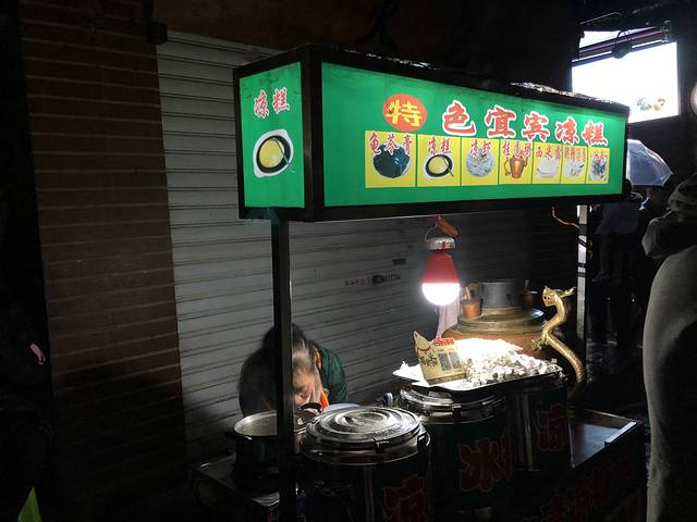 在烧鸡点门口,一特色宜宾凉糕流动小摊,吸引了我们。虽然吃不下美味的烧鸡,但是饭后甜点还是可以品尝一下的。在这个灯光昏暗的小摊上,有各种各样的冰粉、西米露等特色小吃,配上阿姨特制的红糖水,非常好吃!