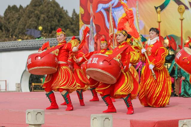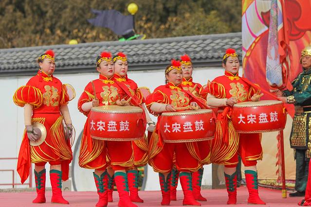 第一轮上场的是大宋腰鼓队,只见数十名女性演员身穿喜庆的大红色服饰,身跨腰鼓、铜锣,伴随着欢乐的音乐,敲打了起来。