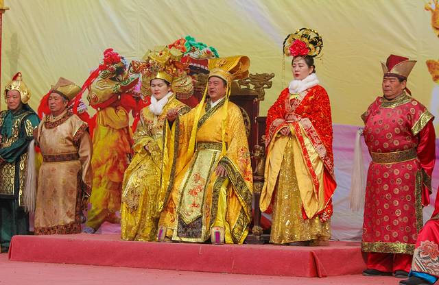 随后在将士们的护送下,皇帝与皇后、公主、文武大臣便一起登场了。皇帝对台下的观众们作了一番贺新春之类的祝福词,演出便正式开始了。